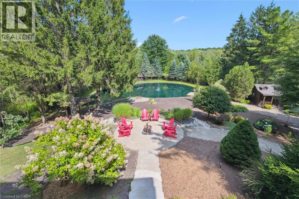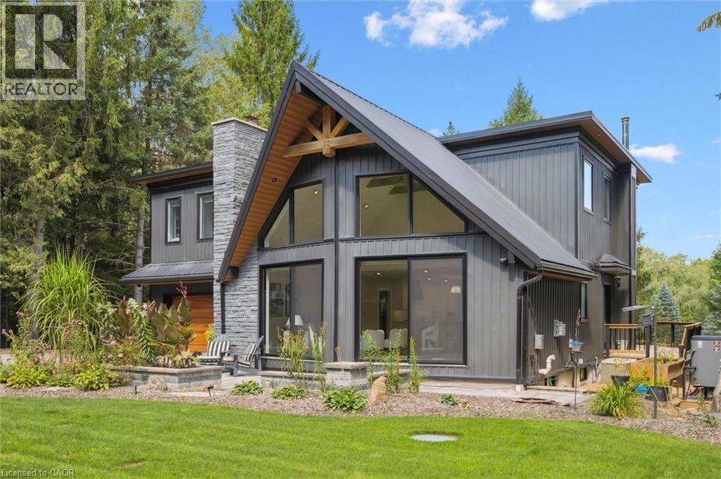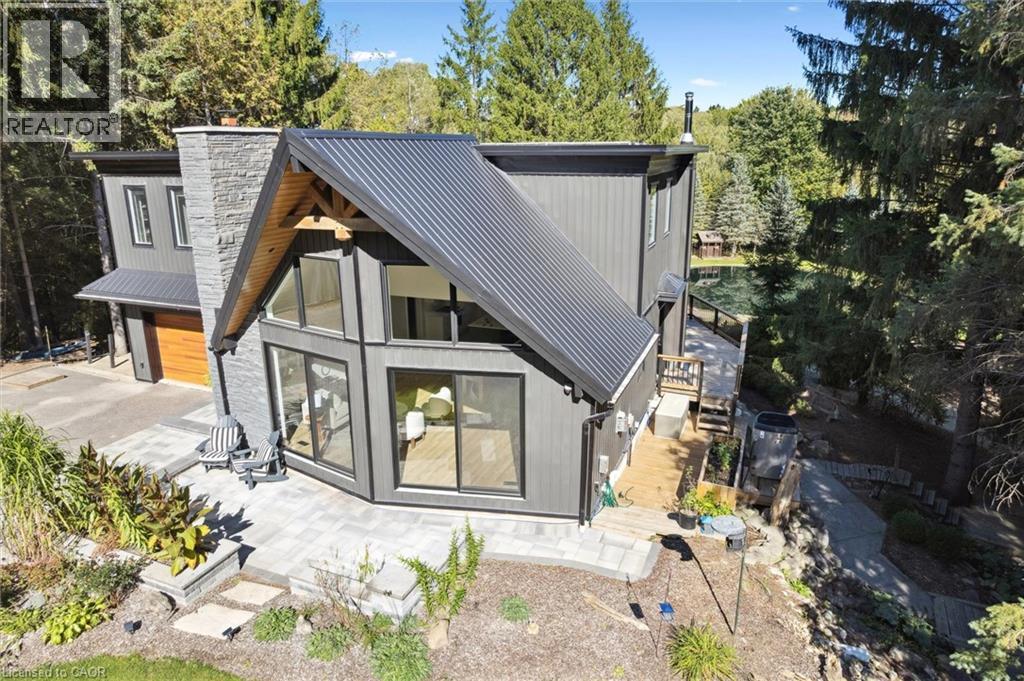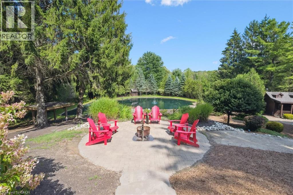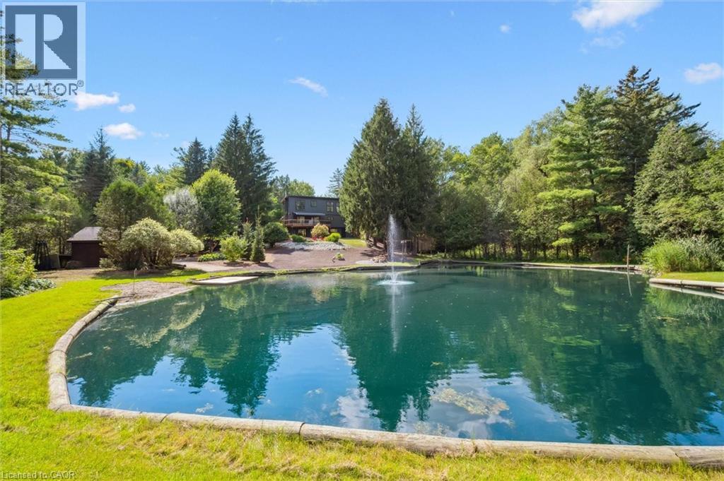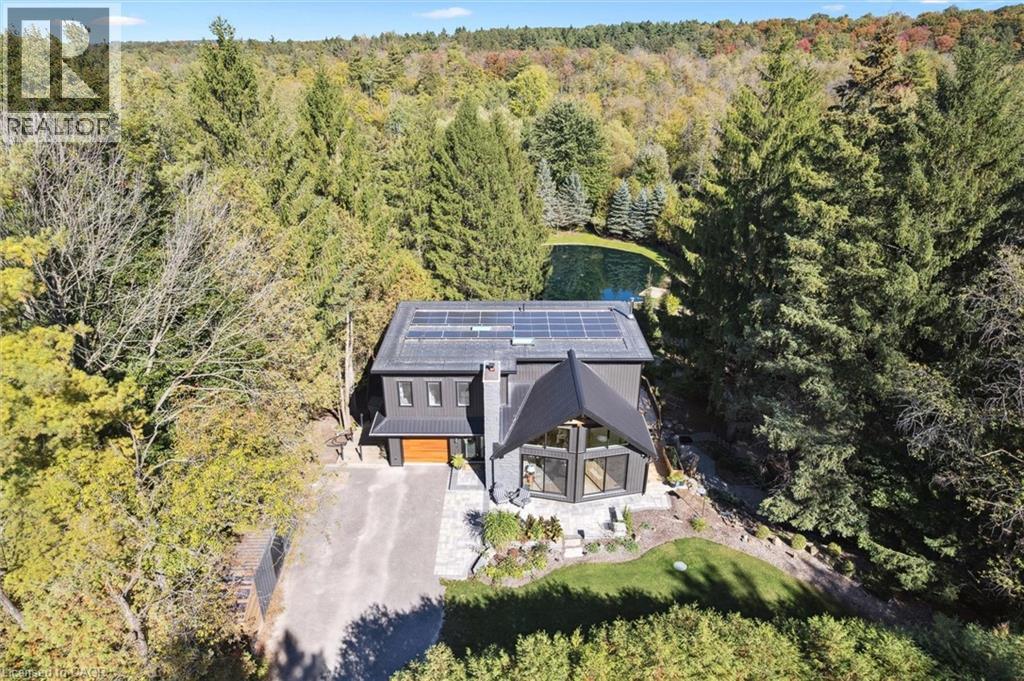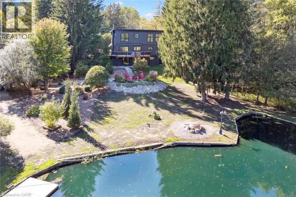 Private Oasis in Waterloo. This one-of-a-kind, fully renovated home offers a cottage-like retreat just minutes from city amenities. Set on 3.7 acres surrounded by trees, a pond, and nature, it combines luxury finishes with smart home technology to create a truly signature property. Inside, the open-concept living room features soaring vaulted ceilings, a propane fireplace, and expansive windows that flood the space with natural light. The chef’s kitchen boasts quartz counters, a spacious island, high-end appliances, pot filler, custom backsplash, and an adjoining pantry with built-in microwave, additional oven, fridge, wine rack, and storage. Perfect for entertaining, the main floor also includes a stylish dining area, built-in bar, walkout to a deck with power awning, and a 4-pc bath. Upstairs, the primary suite is a private sanctuary with breathtaking views, a large walk-in closet, and a spa-like 5-pc ensuite featuring a soaker tub, glass shower, and double sinks. Two additional bedrooms, a 3-pc bath, and convenient upper-level laundry complete this floor. The finished lower level includes heated tile floors, a rec room with cozy wood fireplace and walkout, rough-in for a wet bar, an additional bedroom, office with separate entrance, and a 3-pc bath.The mechanical features include updated electrical & plumbing, Lennox heat pump with backup propane furnace, R/O system and new carbon filter for drilled well, new septic system, solar panels on flat roof generate electricity. Smart home features throughout. Outside, enjoy a private front yard, secondary driveway which allows extra parking, a large patio overlooking the pond with sandy beach and floating dock, plus two charming bunkies—one with a wood stove. All of this within minutes to shopping, schools, markets, and trails. A+++ (id:4069)