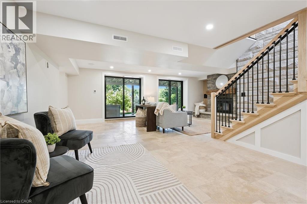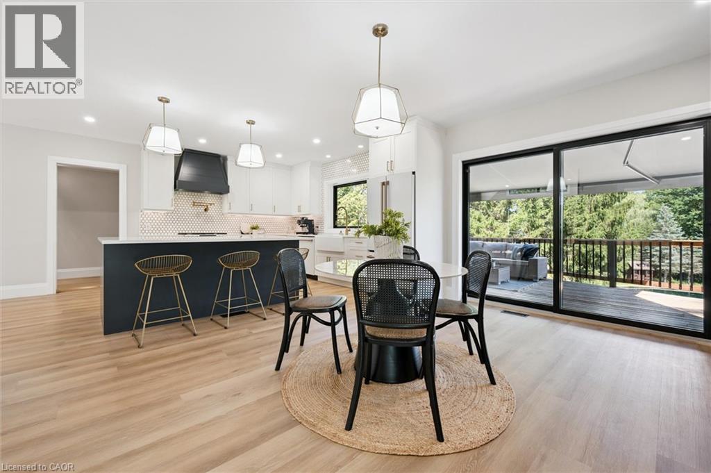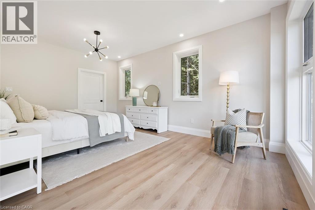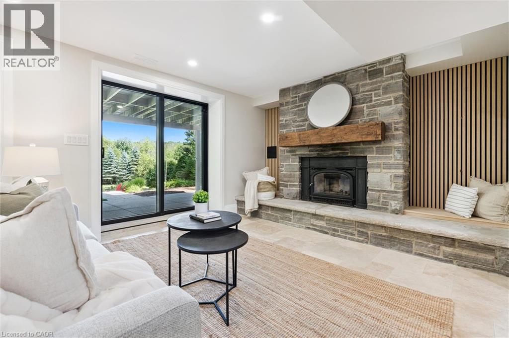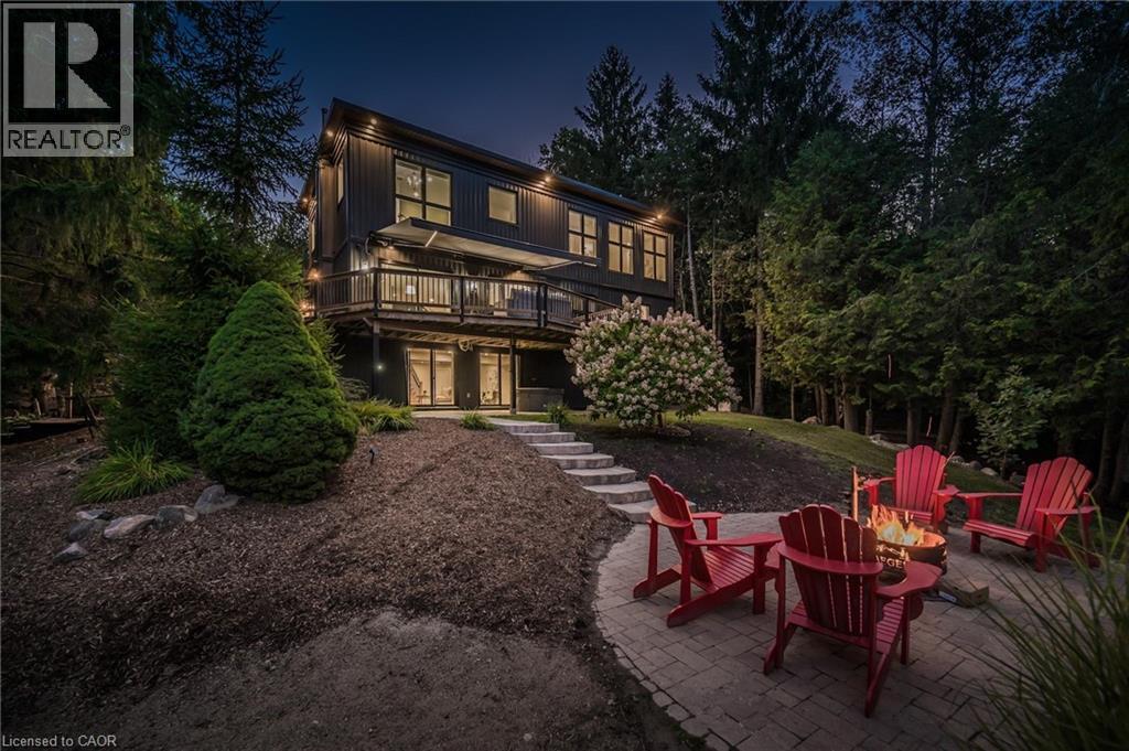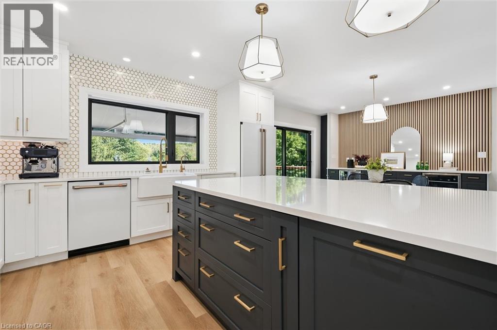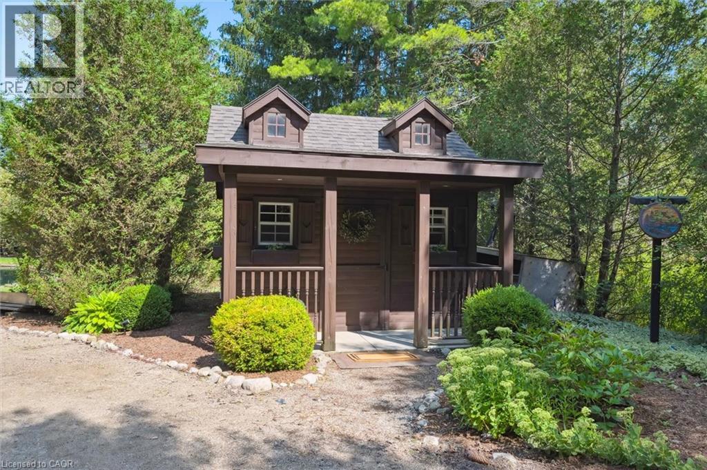 Private Oasis in Waterloo. This one-of-a-kind, fully renovated home offers a cottage-like retreat just minutes from city amenities. Set on 3.7 acres surrounded by trees, a pond, and nature, it combines luxury finishes with smart home technology to create a truly signature property. Inside, the open-concept living room features soaring vaulted ceilings, a propane fireplace, and expansive windows that flood the space with natural light. The chef’s kitchen boasts quartz counters, a spacious island, high-end appliances, pot filler, custom backsplash, and an adjoining pantry with built-in microwave, additional oven, fridge, wine rack, and storage. Perfect for entertaining, the main floor also includes a stylish dining area, built-in bar, walkout to a deck with power awning, and a 4-pc bath. Upstairs, the primary suite is a private sanctuary with breathtaking views, a large walk-in closet, and a spa-like 5-pc ensuite featuring a soaker tub, glass shower, and double sinks. Two additional bedrooms, a 3-pc bath, and convenient upper-level laundry complete this floor. The finished lower level includes heated tile floors, a rec room with cozy wood fireplace and walkout, rough-in for a wet bar, an additional bedroom, office with separate entrance, and a 3-pc bath.The mechanical features include updated electrical & plumbing, Lennox heat pump with backup propane furnace, R/O system and new carbon filter for drilled well, new septic system, solar panels on flat roof generate electricity. Smart home features throughout. Outside, enjoy a private front yard, secondary driveway which allows extra parking, a large patio overlooking the pond with sandy beach and floating dock, plus two charming bunkies—one with a wood stove. All of this within minutes to shopping, schools, markets, and trails. A+++ (id:4069)