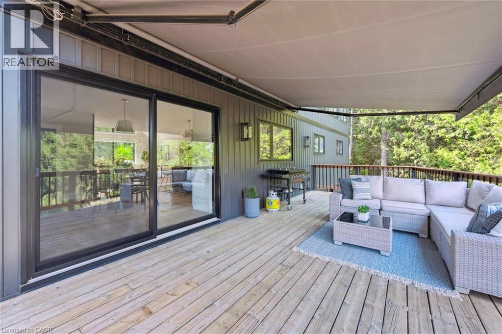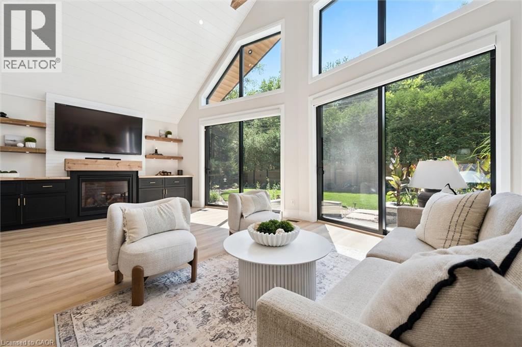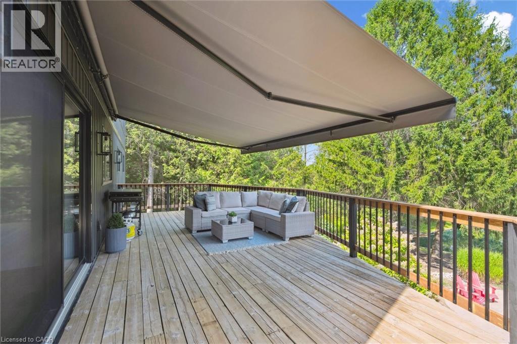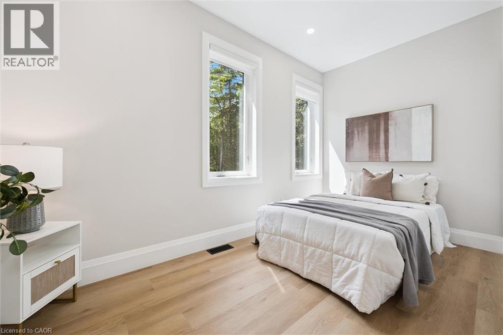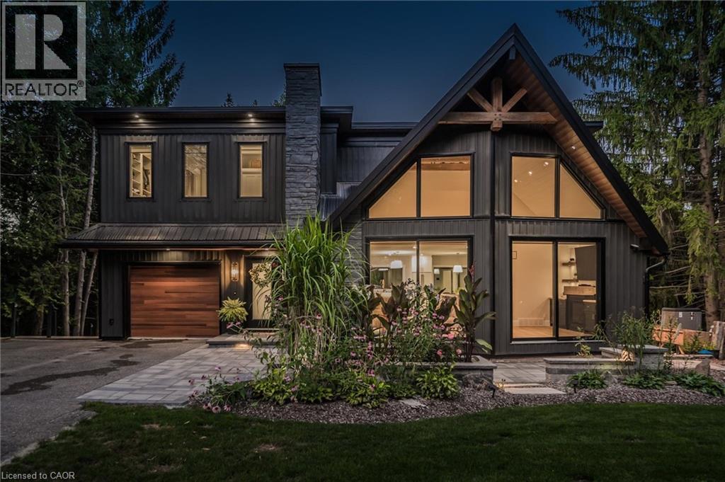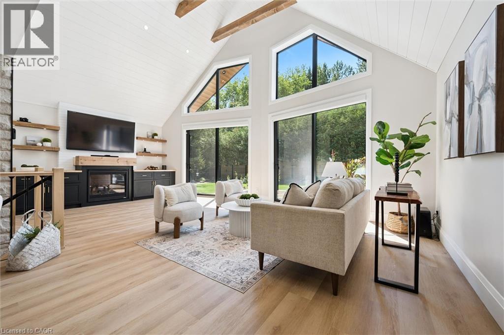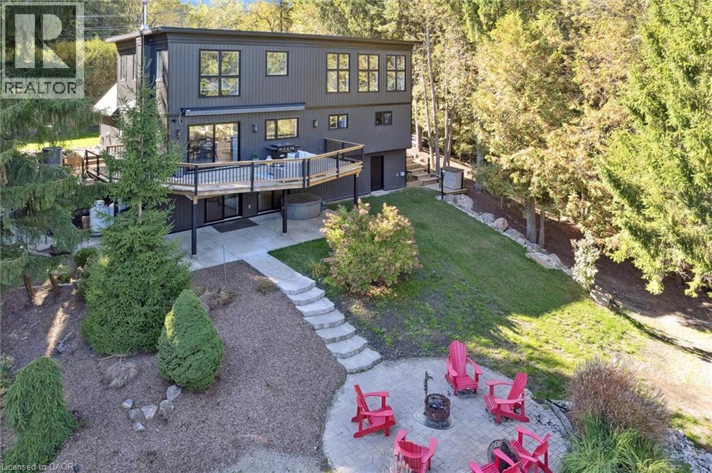 Private Oasis in Waterloo. This one-of-a-kind, fully renovated home offers a cottage-like retreat just minutes from city amenities. Set on 3.7 acres surrounded by trees, a pond, and nature, it combines luxury finishes with smart home technology to create a truly signature property. Inside, the open-concept living room features soaring vaulted ceilings, a propane fireplace, and expansive windows that flood the space with natural light. The chef’s kitchen boasts quartz counters, a spacious island, high-end appliances, pot filler, custom backsplash, and an adjoining pantry with built-in microwave, additional oven, fridge, wine rack, and storage. Perfect for entertaining, the main floor also includes a stylish dining area, built-in bar, walkout to a deck with power awning, and a 4-pc bath. Upstairs, the primary suite is a private sanctuary with breathtaking views, a large walk-in closet, and a spa-like 5-pc ensuite featuring a soaker tub, glass shower, and double sinks. Two additional bedrooms, a 3-pc bath, and convenient upper-level laundry complete this floor. The finished lower level includes heated tile floors, a rec room with cozy wood fireplace and walkout, rough-in for a wet bar, an additional bedroom, office with separate entrance, and a 3-pc bath.The mechanical features include updated electrical & plumbing, Lennox heat pump with backup propane furnace, R/O system and new carbon filter for drilled well, new septic system, solar panels on flat roof generate electricity. Smart home features throughout. Outside, enjoy a private front yard, secondary driveway which allows extra parking, a large patio overlooking the pond with sandy beach and floating dock, plus two charming bunkies—one with a wood stove. All of this within minutes to shopping, schools, markets, and trails. A+++ (id:4069)