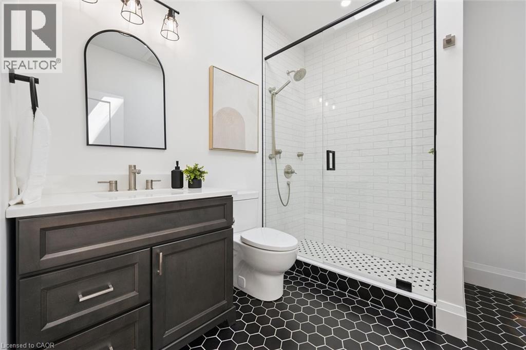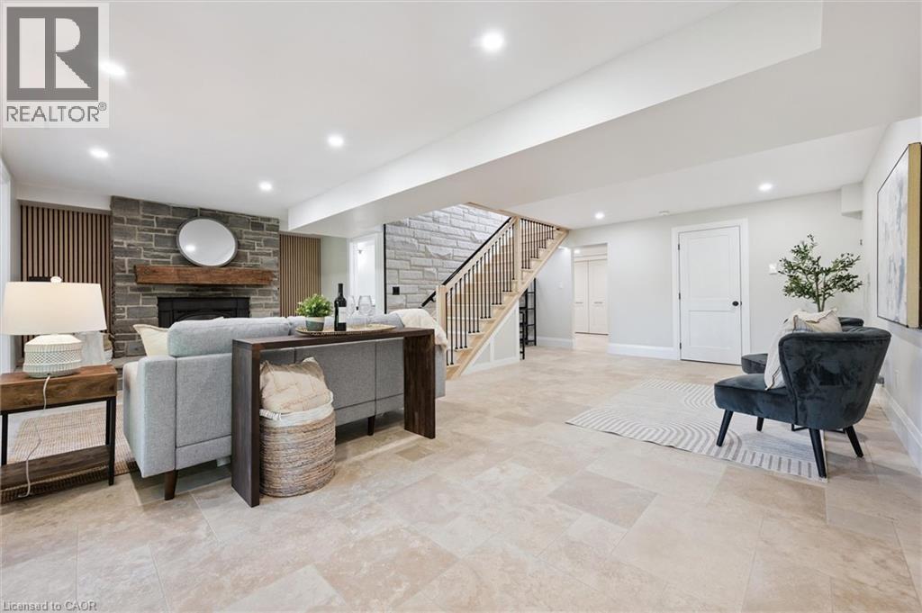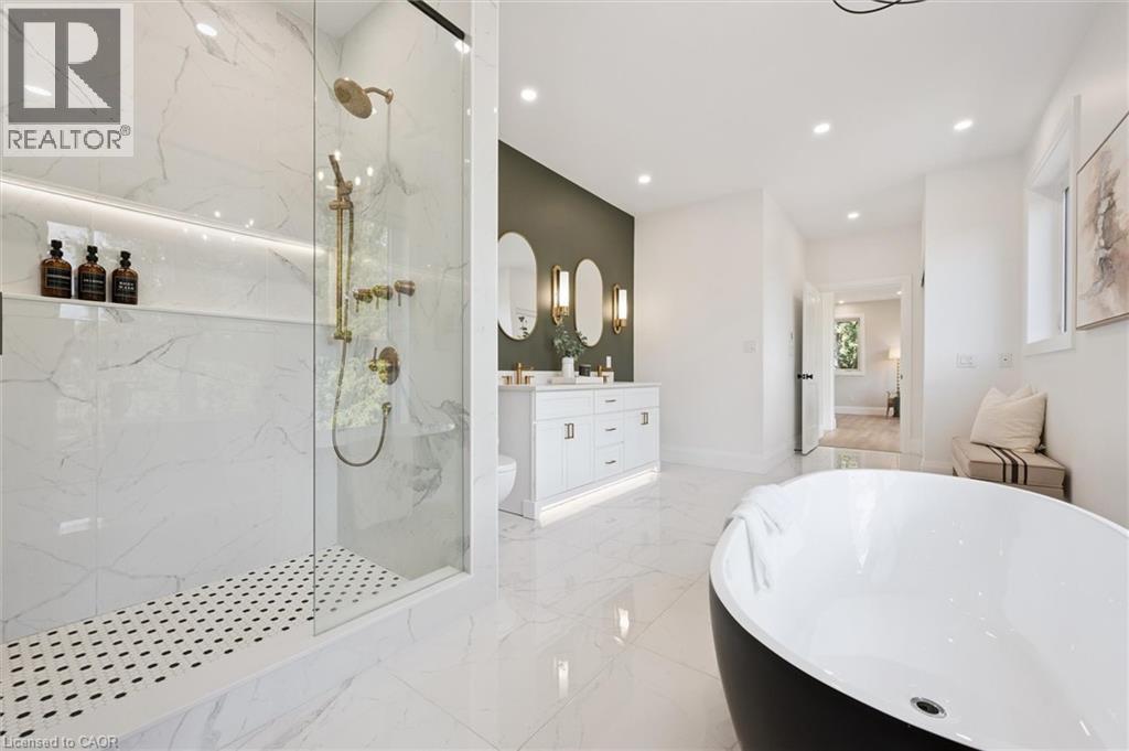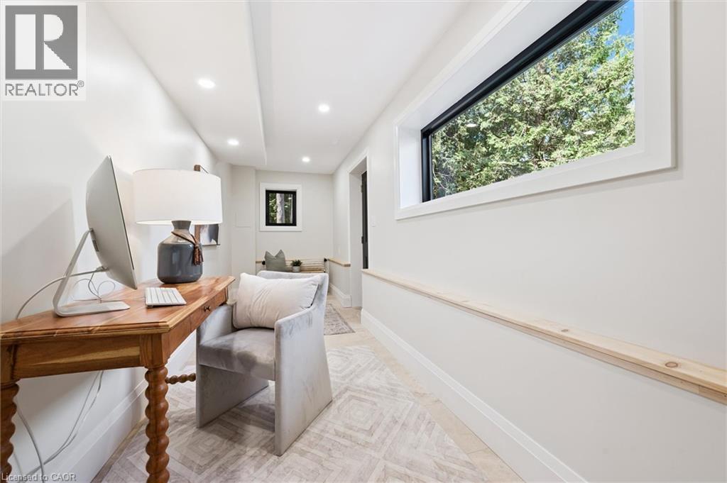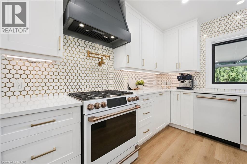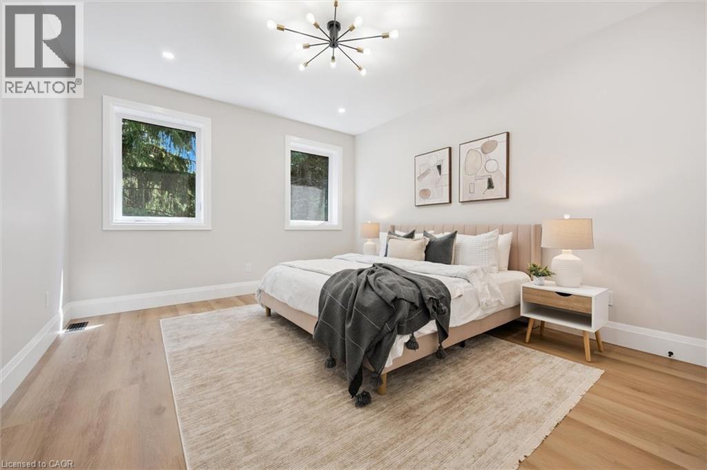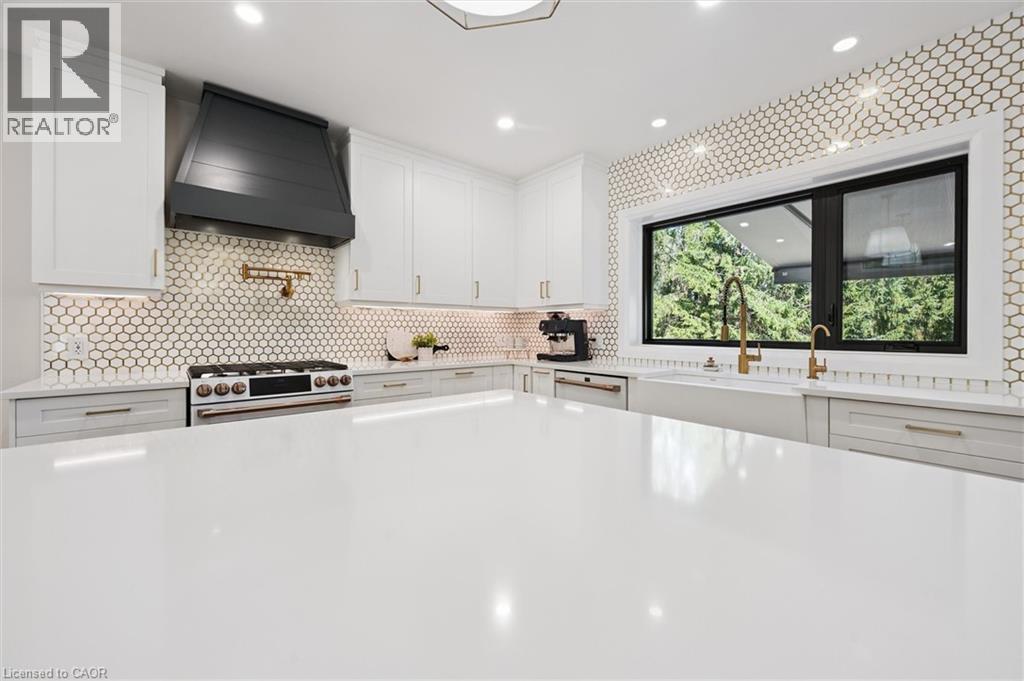 Private Oasis in Waterloo. This one-of-a-kind, fully renovated home offers a cottage-like retreat just minutes from city amenities. Set on 3.7 acres surrounded by trees, a pond, and nature, it combines luxury finishes with smart home technology to create a truly signature property. Inside, the open-concept living room features soaring vaulted ceilings, a propane fireplace, and expansive windows that flood the space with natural light. The chef’s kitchen boasts quartz counters, a spacious island, high-end appliances, pot filler, custom backsplash, and an adjoining pantry with built-in microwave, additional oven, fridge, wine rack, and storage. Perfect for entertaining, the main floor also includes a stylish dining area, built-in bar, walkout to a deck with power awning, and a 4-pc bath. Upstairs, the primary suite is a private sanctuary with breathtaking views, a large walk-in closet, and a spa-like 5-pc ensuite featuring a soaker tub, glass shower, and double sinks. Two additional bedrooms, a 3-pc bath, and convenient upper-level laundry complete this floor. The finished lower level includes heated tile floors, a rec room with cozy wood fireplace and walkout, rough-in for a wet bar, an additional bedroom, office with separate entrance, and a 3-pc bath.The mechanical features include updated electrical & plumbing, Lennox heat pump with backup propane furnace, R/O system and new carbon filter for drilled well, new septic system, solar panels on flat roof generate electricity. Smart home features throughout. Outside, enjoy a private front yard, secondary driveway which allows extra parking, a large patio overlooking the pond with sandy beach and floating dock, plus two charming bunkies—one with a wood stove. All of this within minutes to shopping, schools, markets, and trails. A+++ (id:4069)
