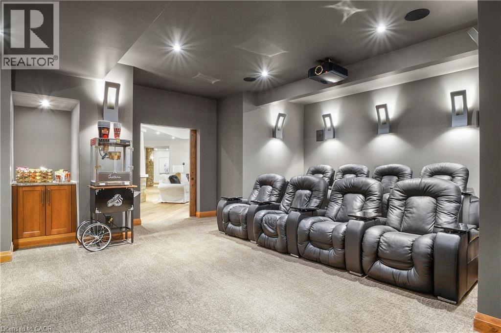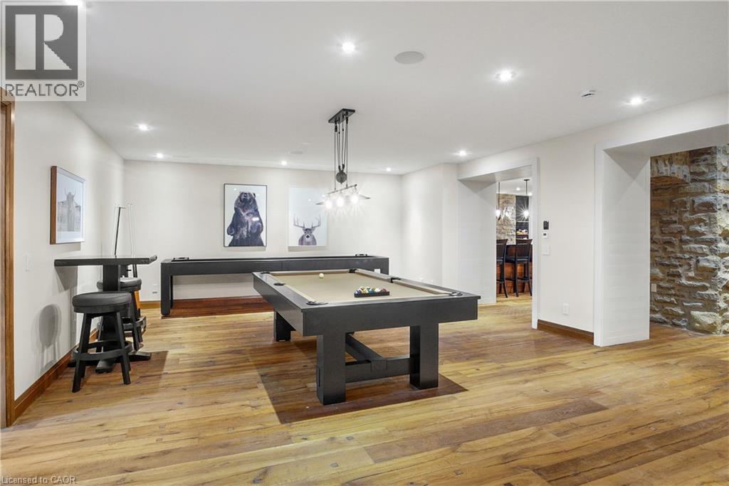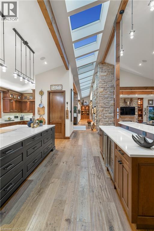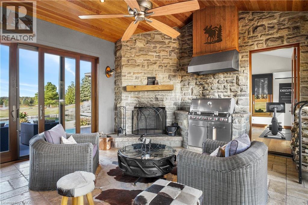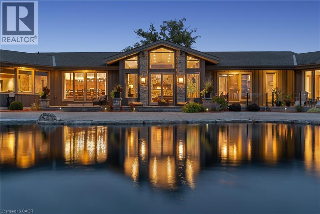 Experience an extraordinary retreat set on over 120 acres of natural beauty. This custom stone bungalow, spanning 10,454.23 sq. ft., showcases high-quality finishes and thoughtful design. Step into the gourmet kitchen, equipped with Viking Professional appliances, Silestone Quartz surfaces, and striking Douglas fir beams. The dual islands invite gatherings, while the dining area offers seating for 14, overlooking a scenic ponds. High ceilings throughout the home create an open, inviting space, while the use of stone and wood details adds a warm, cozy atmosphere. Hand-chipped stone accents and skylights flood the interior with natural light, enhancing the home's connection to its surroundings. The primary suite opens directly to the swim ponds, offering indoor-outdoor living and a spa-like ensuite with a jacuzzi tub beside a gas fireplace. An indoor grilling area with heated floors offers year-round enjoyment, making it an ideal space for entertaining. The lower level is designed for fun and relaxation, featuring a full bar, billiards area, wine cellar, and a private cinema for movie nights. Outdoors, you'll find two ponds: one with a sandy beach and waterfall, and the other stocked for fishing. A heated, 4,000 sq. ft. exterior building with in-floor heating adds both function and flexibility to this expansive property. Explore the trails, unwind in the sitting areas, and enjoy this ultimate private getaway! (id:4069)