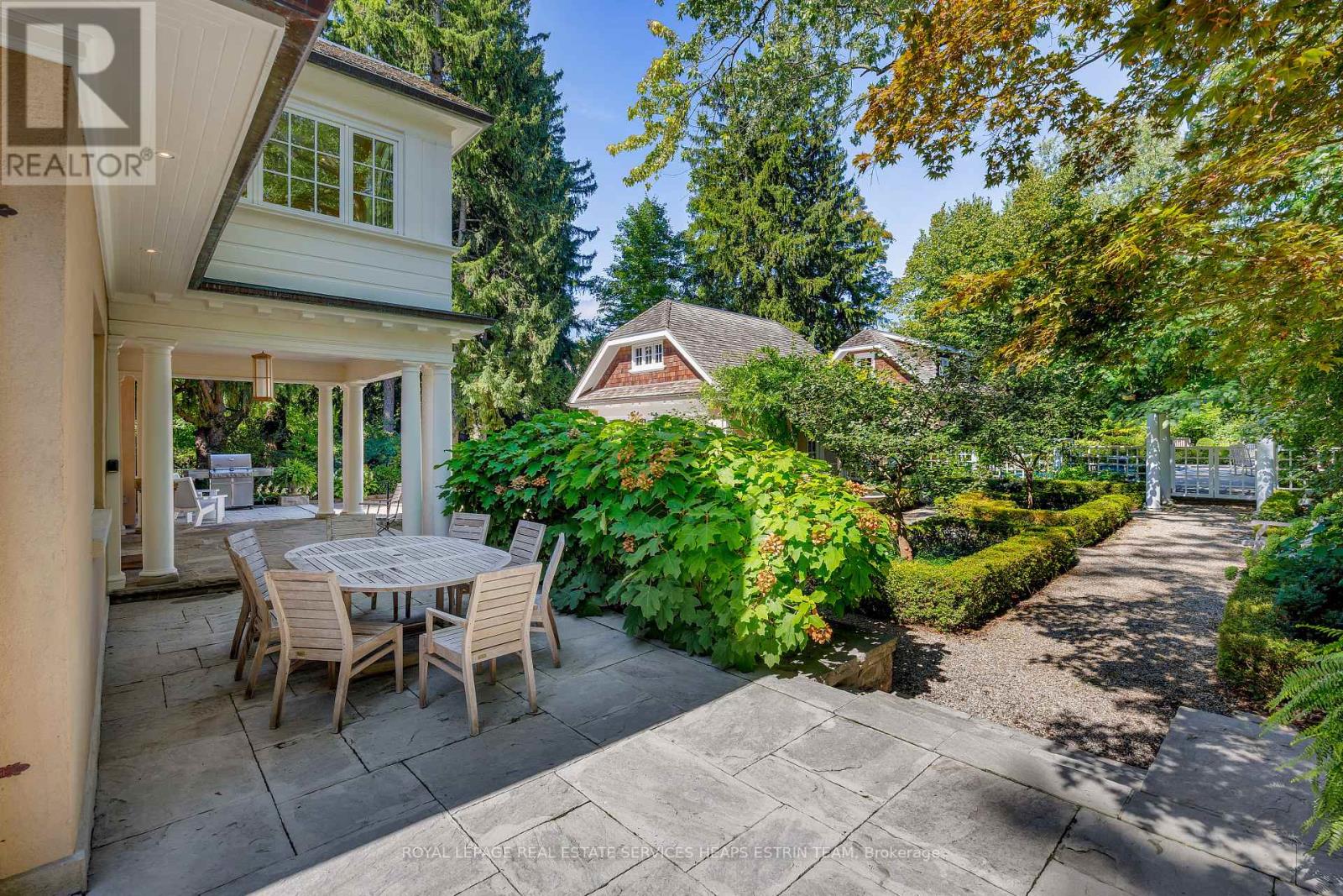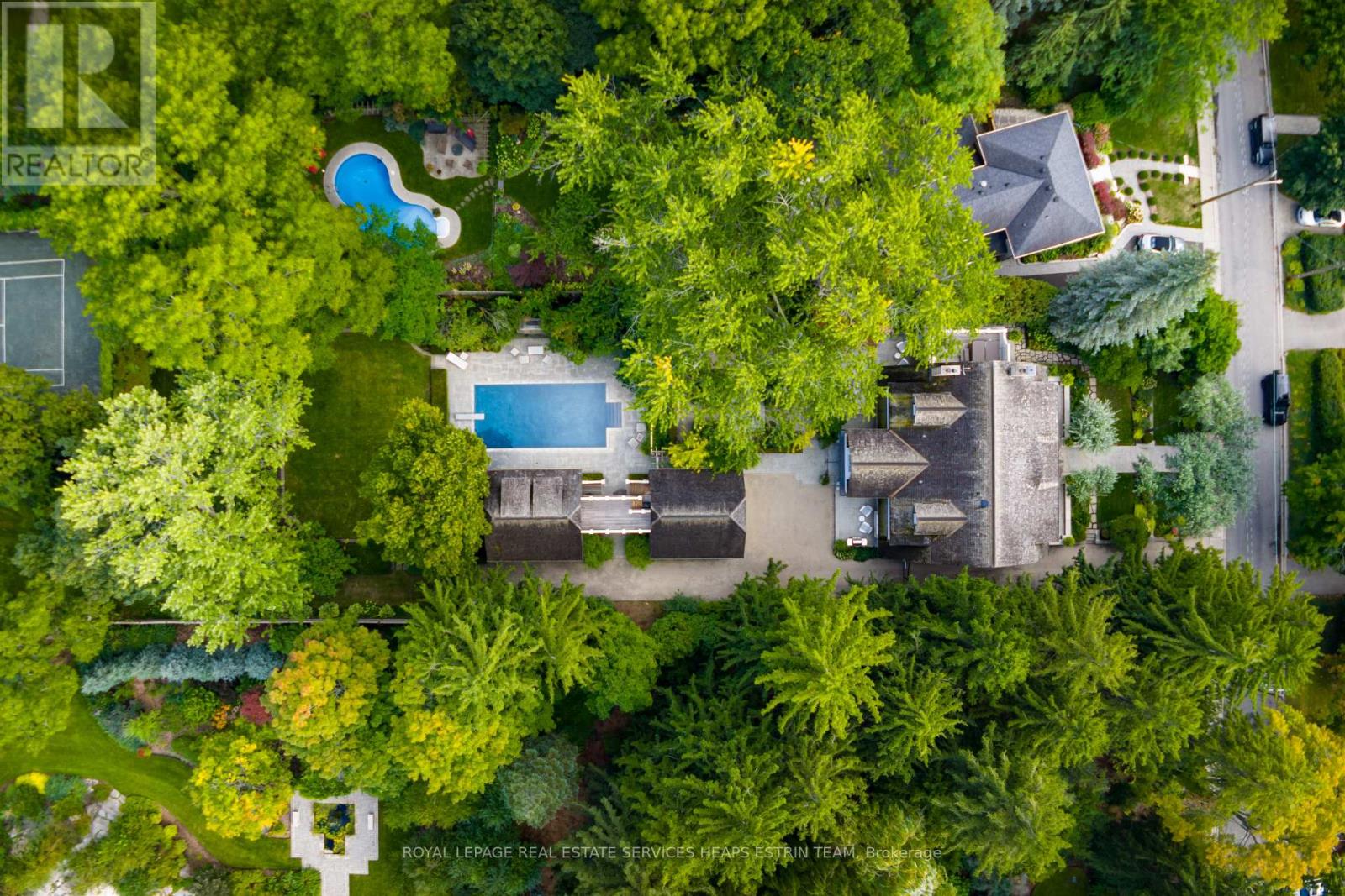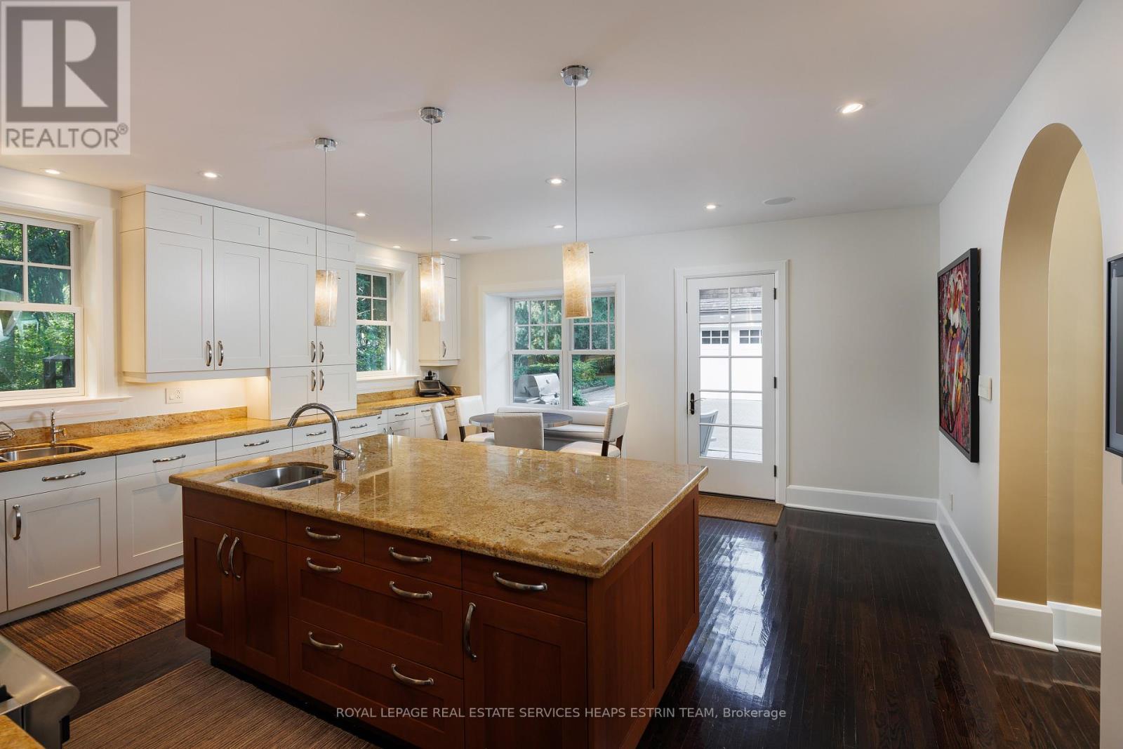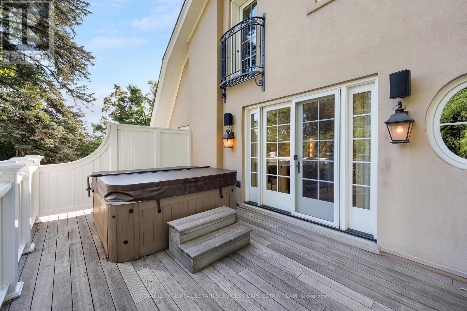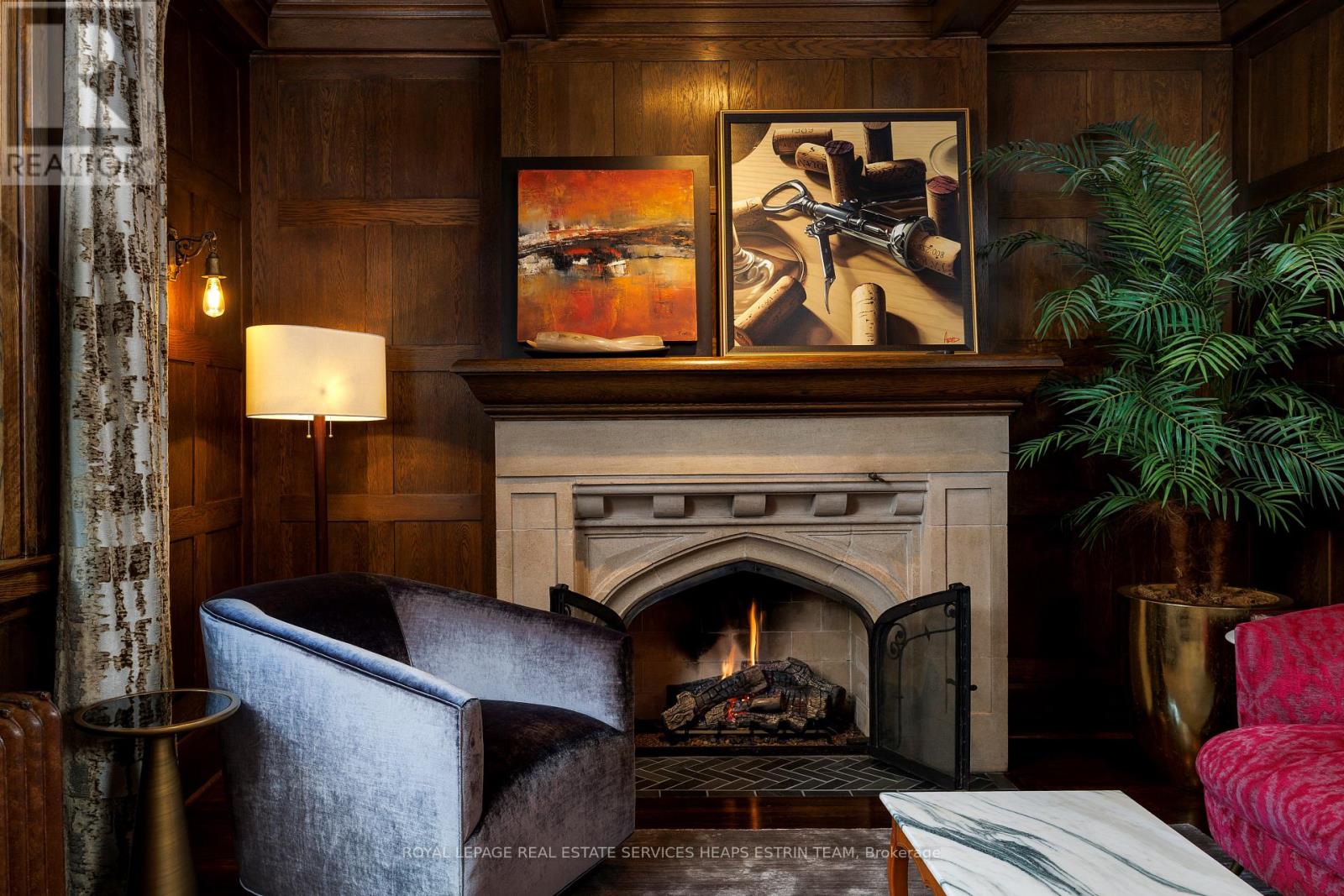 A landmark estate in St. George's Park. Privately set on one of Guelph's most prestigious streets, 75 Queen Street is a legacy residence of rare scale and architectural significance. This fully reimagined Dutch Colonial estate sits elevated on an 89 x 264-foot lot, surrounded by professionally designed grounds that have been meticulously cultivated and maintained for over 25 years. The exterior offers resort-quality living, with a saltwater pool, wood-burning fireplace, outdoor shower, and dedicated pool bathroom, framed by mature trees and layered stonework. The sense of privacy and serenity is immediate. Inside, the home spans over 5,700 square feet of finished space and follows a classic centre-hall plan with gracious flow and custom detail throughout. The main level includes a grand great room, formal dining room, glass-enclosed sunroom, chef's kitchen with granite surfaces and premium appliances, and a private office. Upstairs, the primary suite features two fireplaces, a walk-in closet, a five-piece ensuite, and a private balcony with hot tub. The third floor offers additional bedrooms, a large family room with wet bar, and elevated views of the gardens and city skyline. The fully finished lower level includes radiant heated floors, a home theatre, cigar lounge with ventilation, wine cellar, kitchenette, and full laundry. A detached garage and separate outbuilding provide parking for four vehicles, a sauna, a full bath, and two upper lofts that are ideal for guest accommodation, a studio, or a wellness retreat. In total, there is parking for 14 vehicles. All buildings are security-monitored and equipped with heat sensors, ensuring peace of mind and enhanced safety throughout the estate. Just steps to St. George's Park and within walking distance to downtown, the GO Station, and top schools, this property presents a rare opportunity to own one of Guelph's most iconic estates. Timeless, private, and built without compromise. (id:4069)