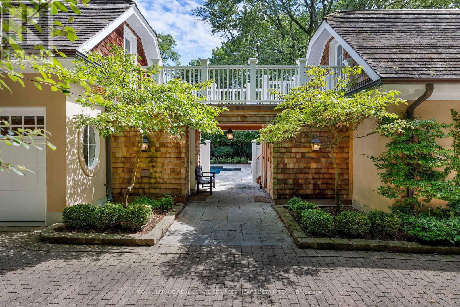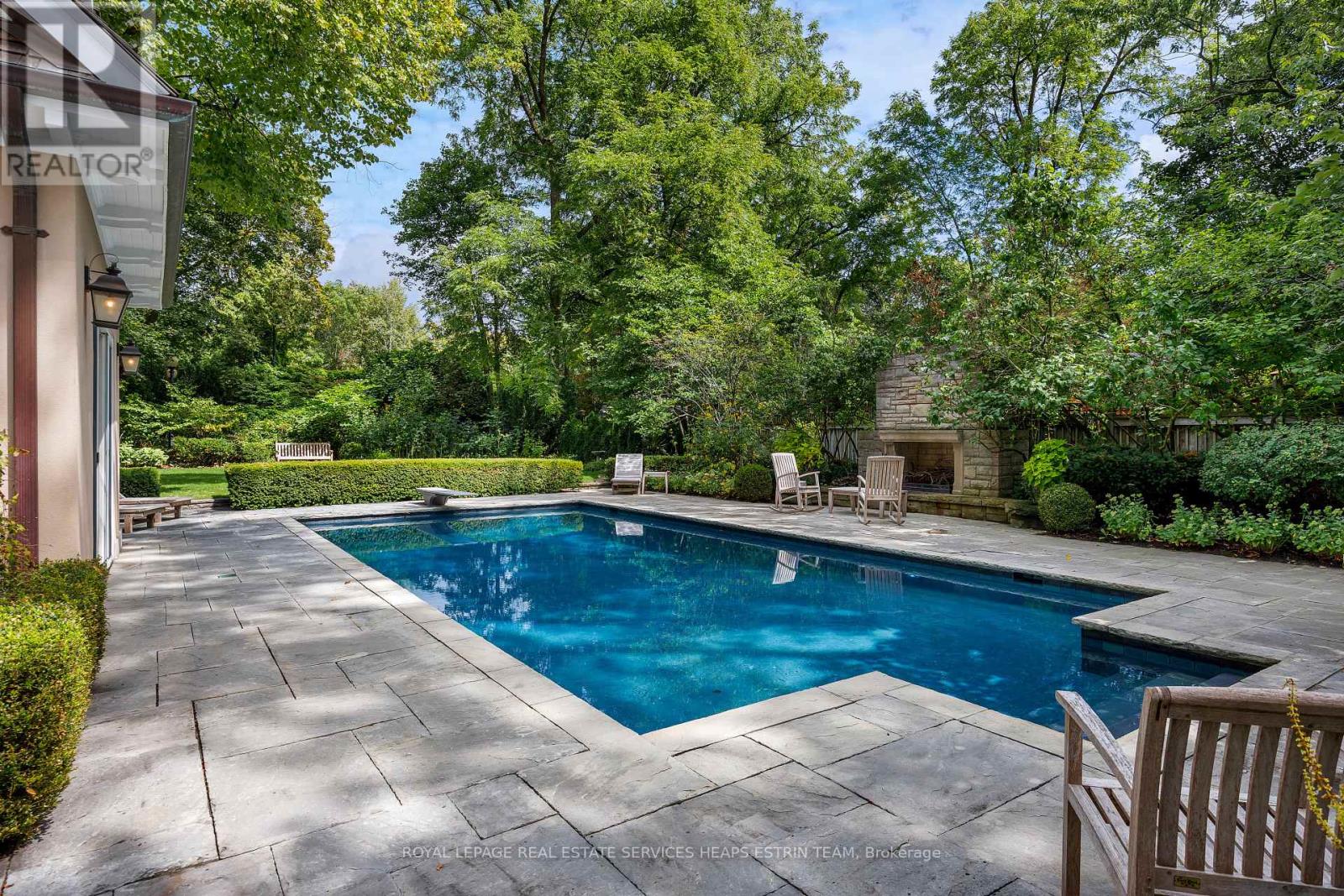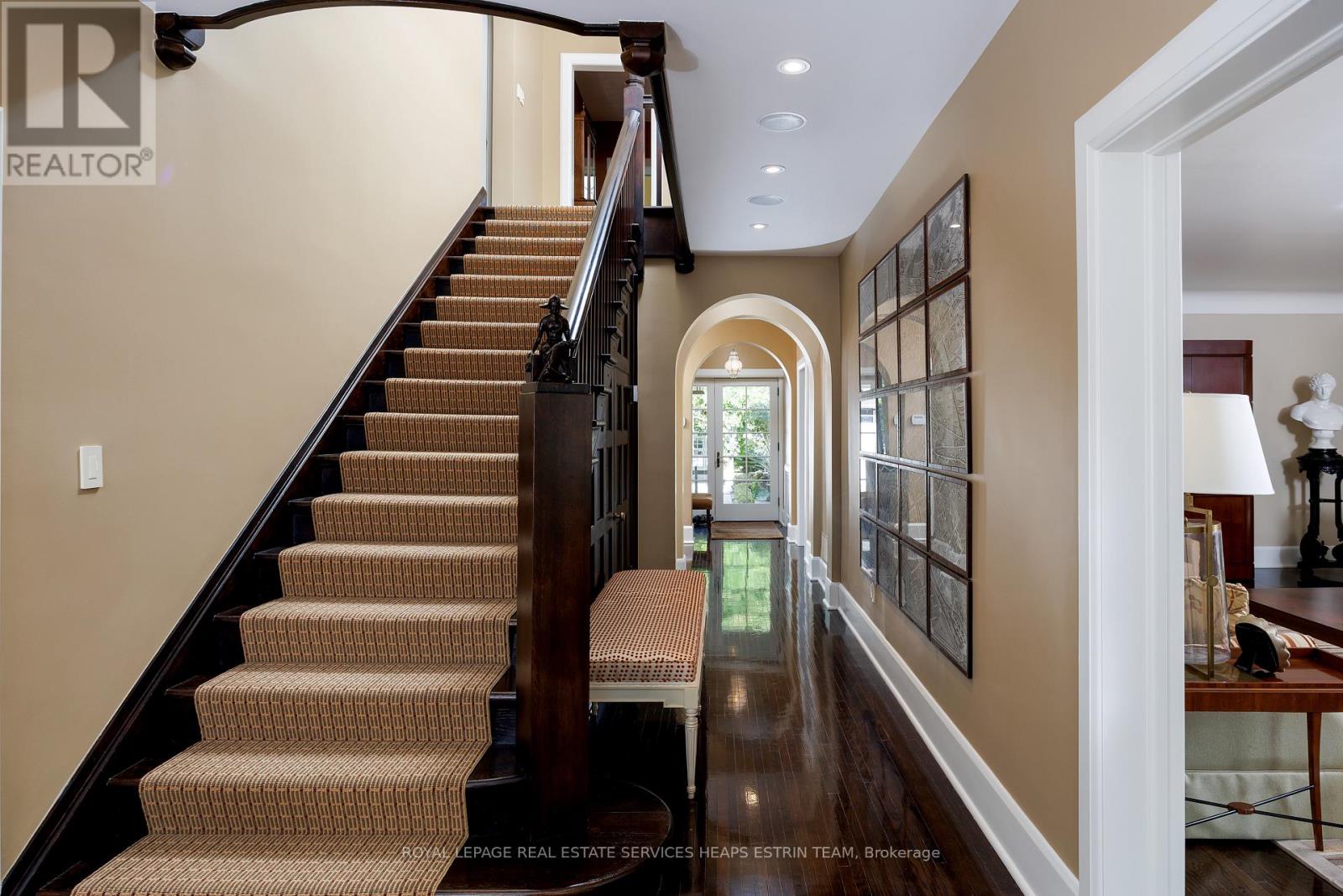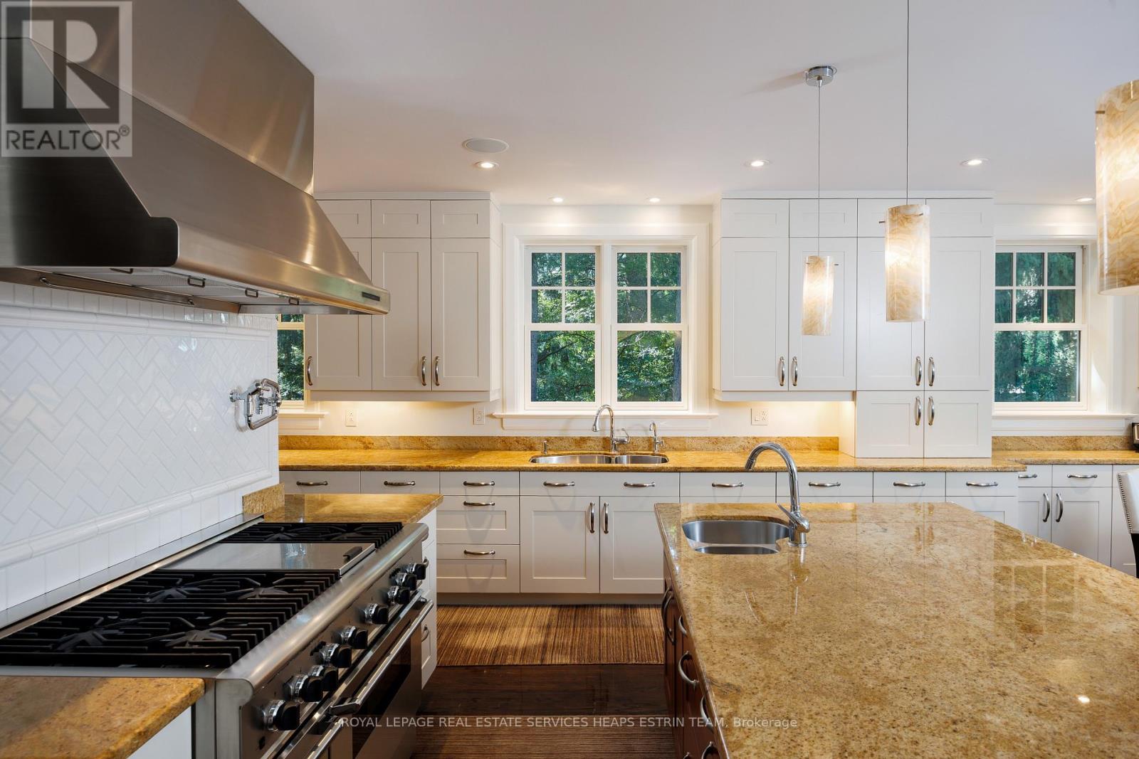 A landmark estate in St. George's Park. Privately set on one of Guelph's most prestigious streets, 75 Queen Street is a legacy residence of rare scale and architectural significance. This fully reimagined Dutch Colonial estate sits elevated on an 89 x 264-foot lot, surrounded by professionally designed grounds that have been meticulously cultivated and maintained for over 25 years. The exterior offers resort-quality living, with a saltwater pool, wood-burning fireplace, outdoor shower, and dedicated pool bathroom, framed by mature trees and layered stonework. The sense of privacy and serenity is immediate. Inside, the home spans over 5,700 square feet of finished space and follows a classic centre-hall plan with gracious flow and custom detail throughout. The main level includes a grand great room, formal dining room, glass-enclosed sunroom, chef's kitchen with granite surfaces and premium appliances, and a private office. Upstairs, the primary suite features two fireplaces, a walk-in closet, a five-piece ensuite, and a private balcony with hot tub. The third floor offers additional bedrooms, a large family room with wet bar, and elevated views of the gardens and city skyline. The fully finished lower level includes radiant heated floors, a home theatre, cigar lounge with ventilation, wine cellar, kitchenette, and full laundry. A detached garage and separate outbuilding provide parking for four vehicles, a sauna, a full bath, and two upper lofts that are ideal for guest accommodation, a studio, or a wellness retreat. In total, there is parking for 14 vehicles. All buildings are security-monitored and equipped with heat sensors, ensuring peace of mind and enhanced safety throughout the estate. Just steps to St. George's Park and within walking distance to downtown, the GO Station, and top schools, this property presents a rare opportunity to own one of Guelph's most iconic estates. Timeless, private, and built without compromise. (id:4069)