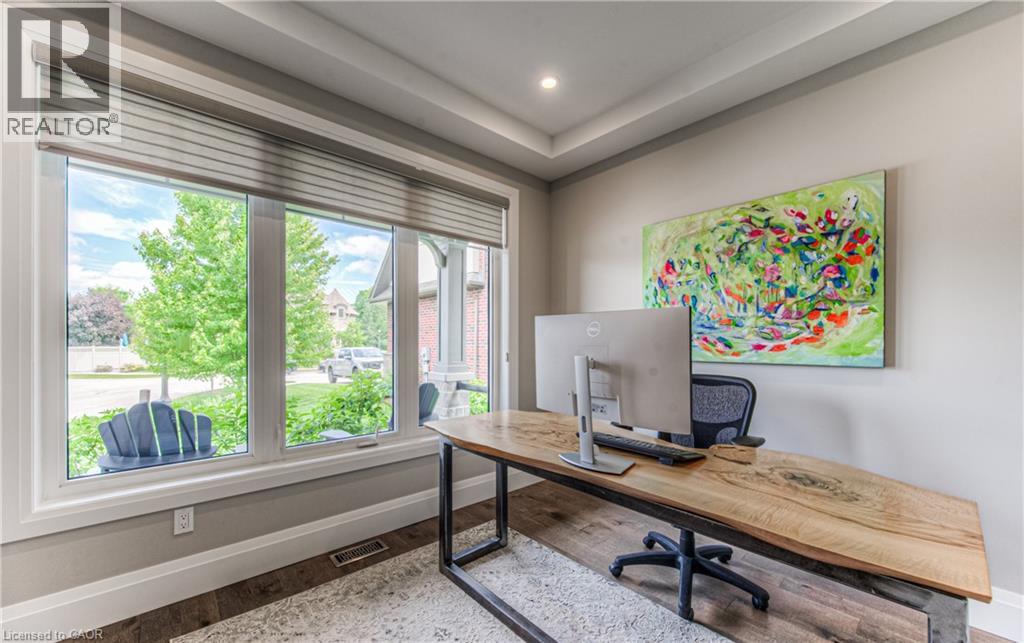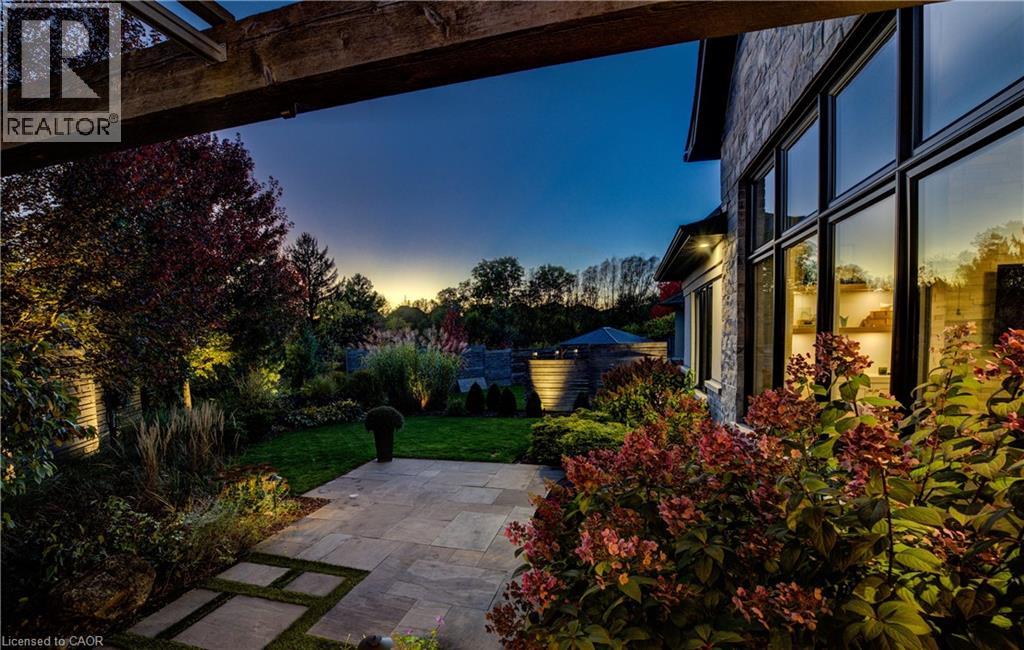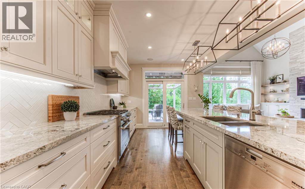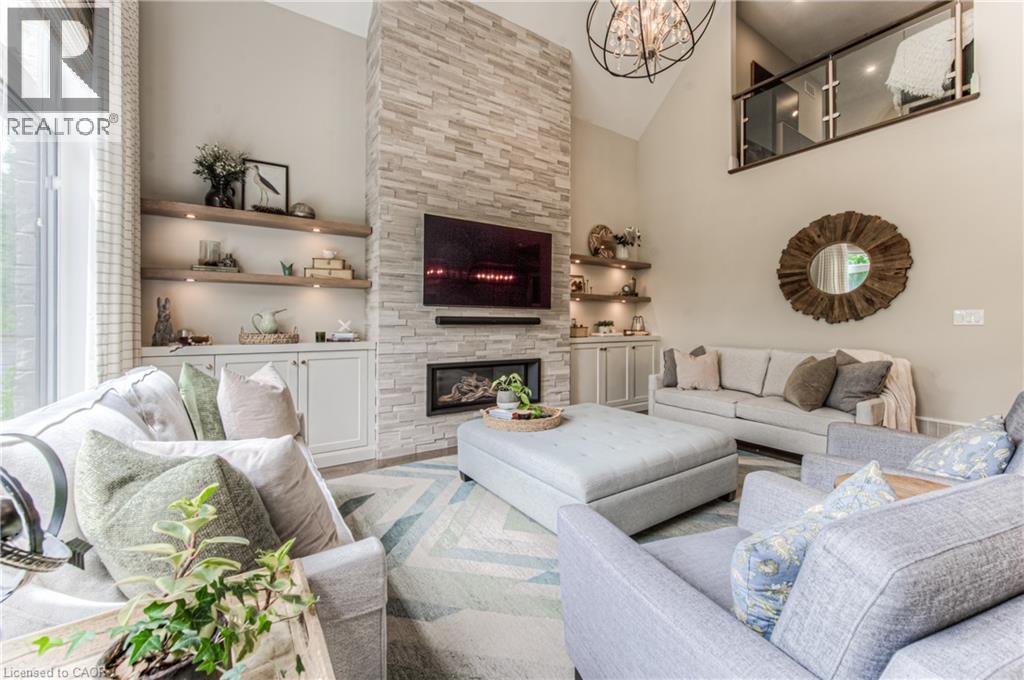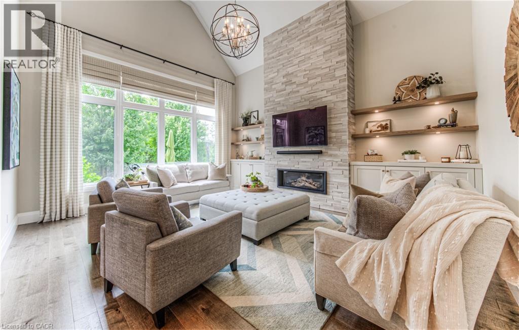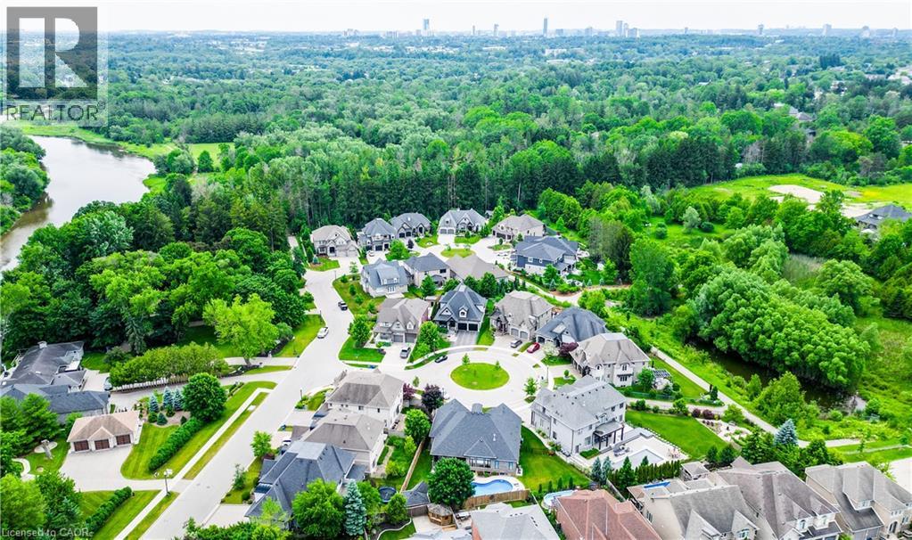 Welcome to a custom-built home that quietly redefines everyday living on one of the most coveted courts in River Ridge - just steps from the winding trails of the Grand River. Set on a peaceful, tree-lined enclave of distinctive custom residences, this executive bungaloft makes an unforgettable first impression with its timeless stone and stucco façade, curated landscaping, and soft architectural lighting. Inside, light pours across warm, elegant spaces designed for both grand entertaining and quiet moments. A dramatic glass-railed staircase anchors the main level, while a private office offers a serene place to work or unwind. The dining room sets the tone for memorable evenings, defined by a striking coffered ceiling and connected seamlessly to the kitchen through a fully appointed butler’s pantry. At the heart of the home, the chef’s kitchen is as beautiful as it is functional, appointed with Cambria quartz surfaces and professional-grade appliances including a six-burner range and oven from Miele, a built-in refrigerator from Sub-Zero, and a dishwasher by Miele. Here, conversations flow effortlessly into the soaring great room, where custom built-ins, a floor-to-ceiling stone fireplace, vaulted ceilings, and Hunter Douglas blinds create a space that feels both grand and inviting. The main-floor primary suite is a private sanctuary - calm, refined, and beautifully appointed with a spa-inspired ensuite designed for true relaxation. Upstairs, the loft level offers a world of its own. Two generous bedrooms, a full bath, and an airy family room create the perfect retreat for children or guests. Outdoors, enjoy summer evenings under the awning, weekend dinners on the flagstone patio, and quiet morning coffee surrounded by lush gardens. Every space has been designed to bring ease and enjoyment to daily living. This is more than a home - it’s a place where custom design, nature, and community come together. (id:4069)