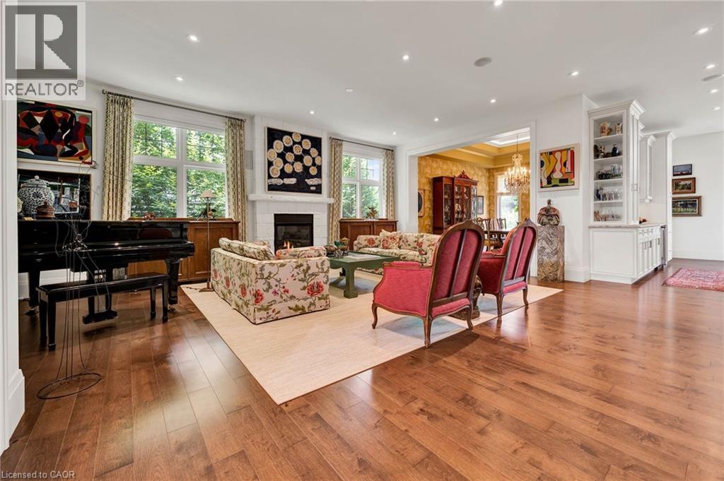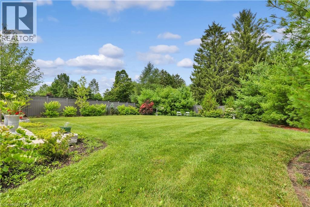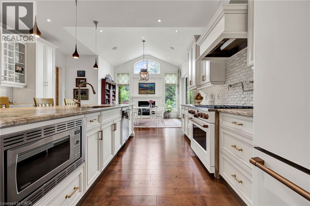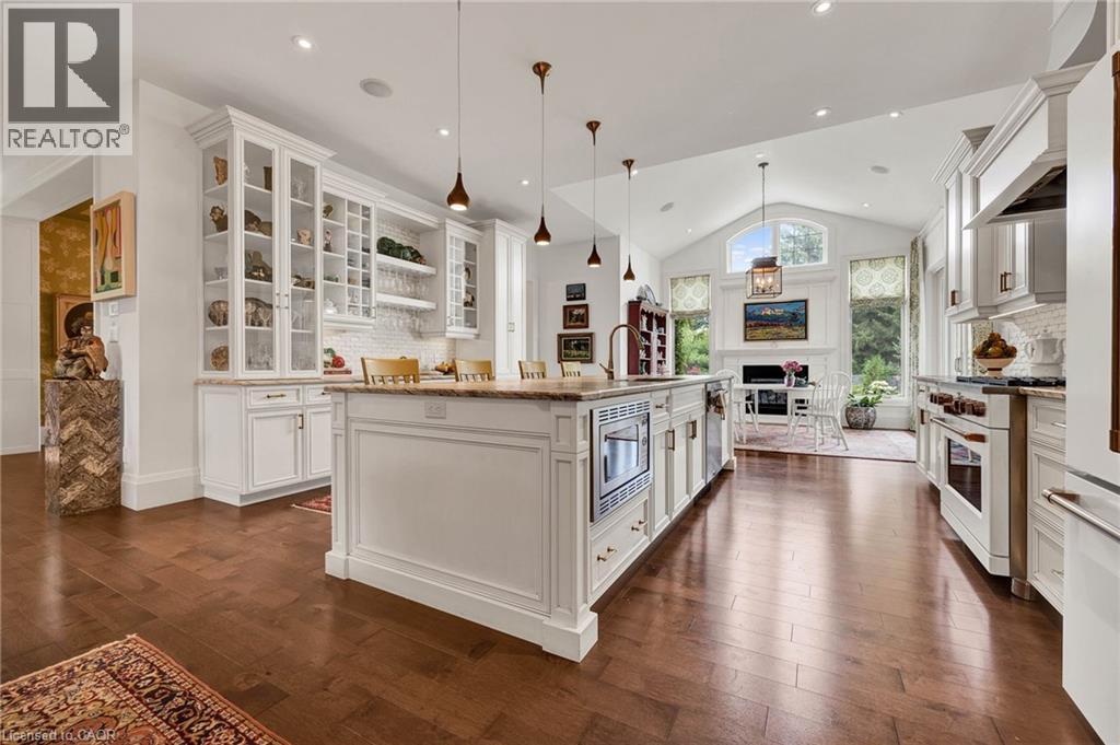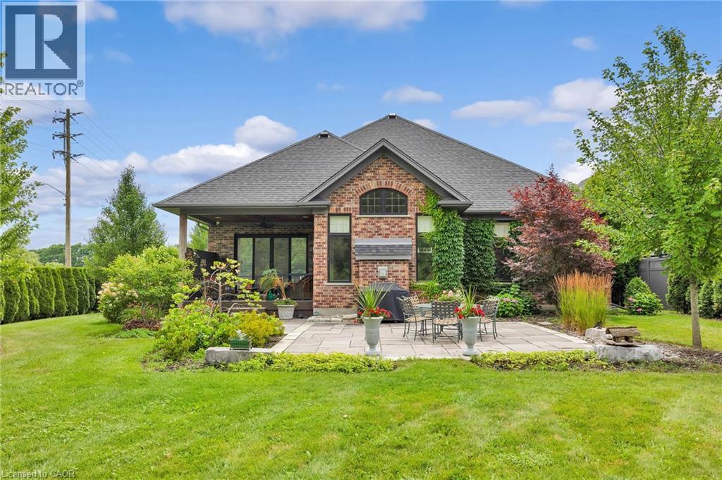 Welcome to 585 Regal Place, a vibrant and distinguished former model home set on a beautifully landscaped corner lot in one of Waterloo’s most desirable and well-maintained enclaves. Nestled on a quiet cul-de-sac, this custom-built bungalow offers over 4,300 sq. ft. of finely curated living space, including more than 3,500 sq. ft. on the main floor, plus an oversized triple-car garage with high ceilings and a workshop area. The cobblestone driveway and covered entry make a striking first impression, leading into an expansive foyer where soaring 10-foot ceilings and an open, flowing layout instantly convey energy and light. Expansive rear windows draw the eye to views of the private gardens and backyard, enhancing the uplifting feel of the home. The executive kitchen is a central hub, featuring custom cabinetry, granite counters, a generous island, and professional-grade appliances. It flows seamlessly to the breakfast area and covered porch, creating an effortless connection between indoor and outdoor living. Formal dining and living spaces are enriched with statement lighting, rich wood flooring, and gallery-like wall space perfect for showcasing art. The primary suite offers a calm retreat, highlighted by a spa-inspired ensuite with a double-sided fireplace, soaker tub, and custom dressing room. Two additional bedrooms, including one with an ensuite, a dedicated office, and main-floor laundry add comfort and flexibility, while the finished lower level provides guest space and areas for recreation or fitness. Outside, extensive landscaping, mature gardens, and multiple sitting areas create an inviting backdrop for gatherings or quiet moments. Nearby trails, golf courses, the St. Jacobs Farmers’ Market, and top-rated schools add to the lifestyle appeal. This home combines elegant design and vibrant energy with practical function, offering an exceptional place to live and thrive. (id:4069)