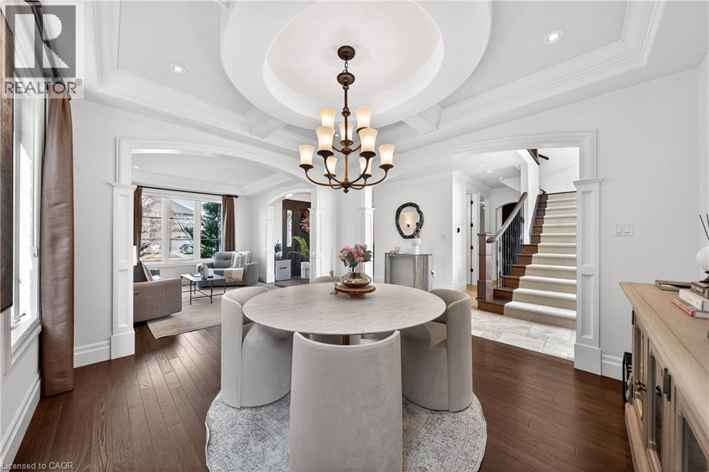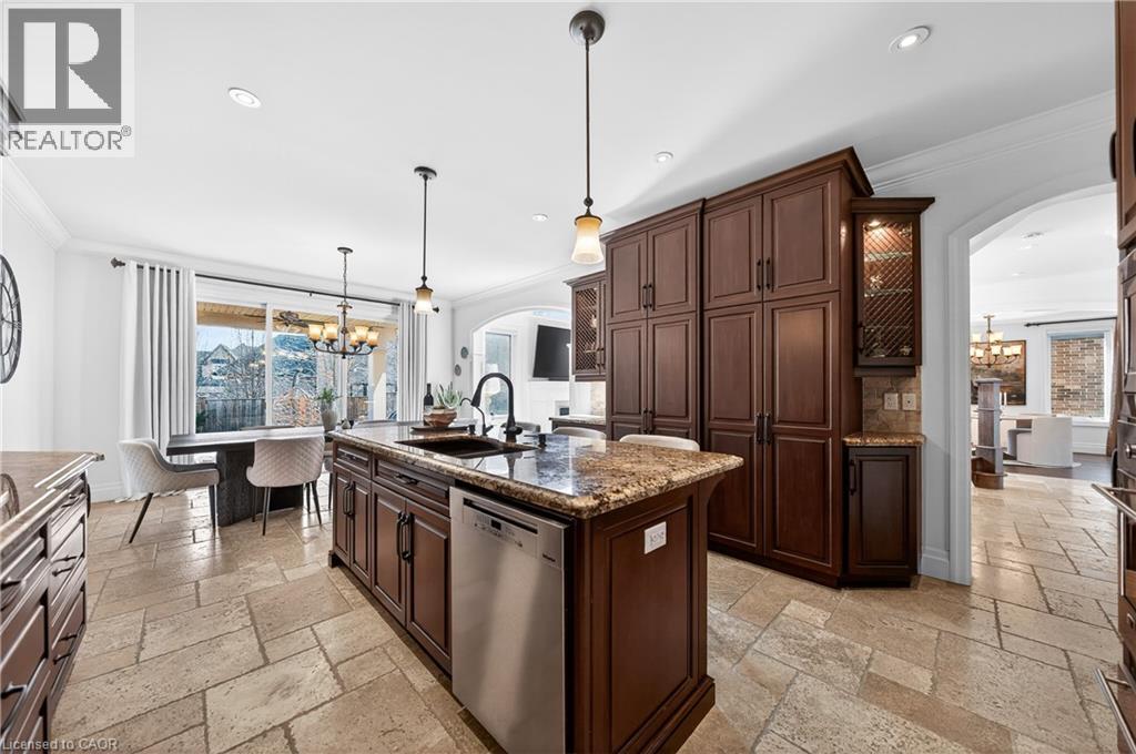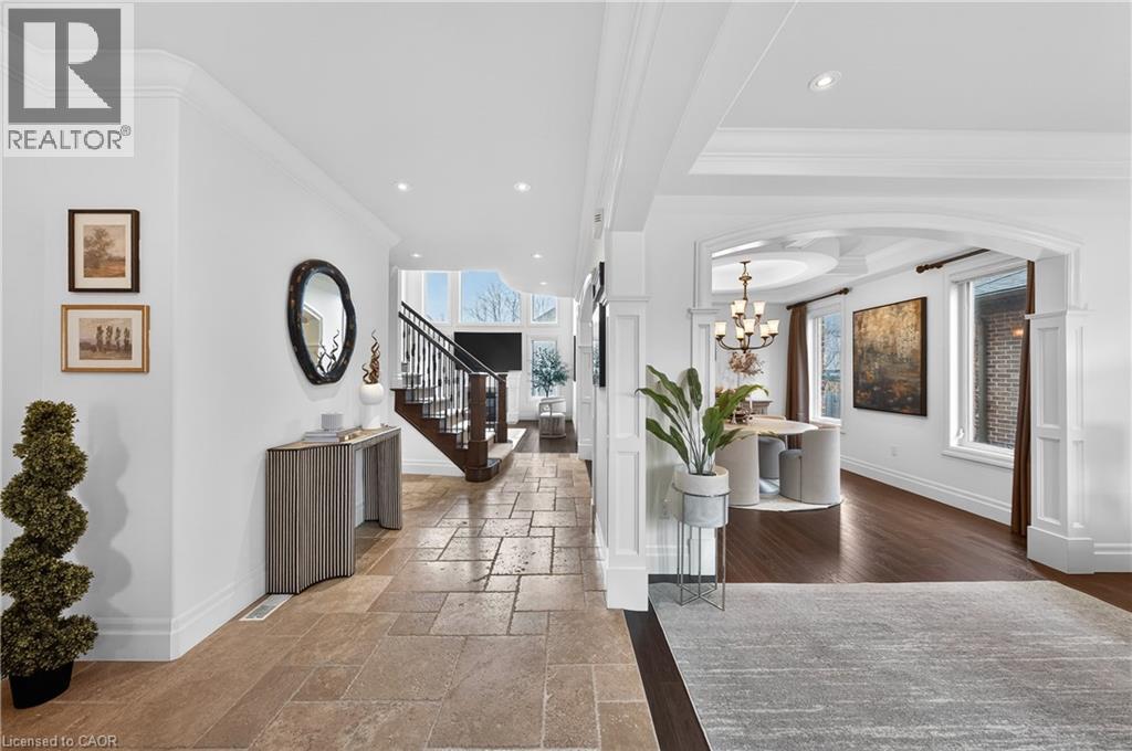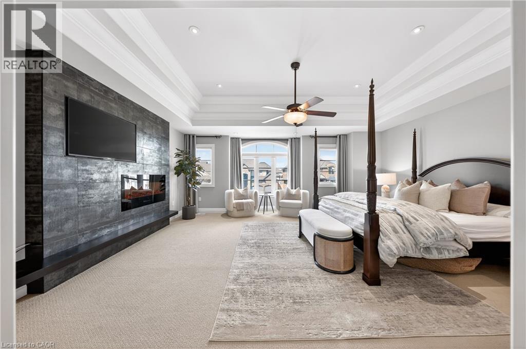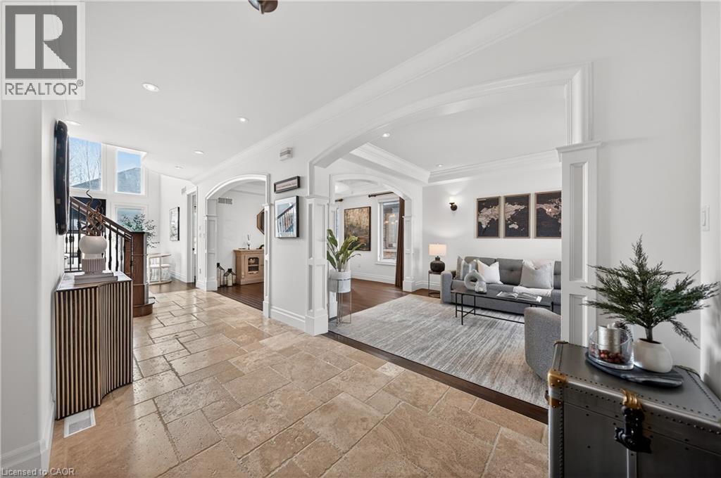 This is your Carriage Crossing dream home. Welcome to 325 Deerfoot Trail, located in one of Waterloo’s most sought-after communities. This custom Klondike-built home offers 5,300+ SF of beautifully finished living space, with 4+1 bedrms & 4 bathrms, thoughtfully designed with quality craftsmanship, timeless finishes, & functional family living. Step inside the grand entry opening to formal living & dining rms with coffered ceilings & detailed millwork. The home is anchored by a stunning 2-storey great rm with gas fireplace & oversized windows flooding the space with natural light. The well-appointed Chervin kitchen features a lrg centre island, granite counters, premium appliances, under-cabinet lighting, backsplash, & a bright breakfast area with walkout to the backyard & covered back porch. The main flr also offers a private office/potential 6th bedrm, mudrm/laundry rm, & powder rm. Upstairs offers 4 spacious bedrms, including an expansive primary retreat with tray ceiling, feature wall with linear electric fireplace, sitting area, walk-in closet with built-ins, additional dual closets, & a 5-pce ensuite with dual vanities, tiled glass shower, & jacuzzi tub. 3 additional sizable bedrms & a 5-pce main bathrm complete the upper level. The fully finished lower level features a lrg rec rm with electric fireplace, additional bedrm, 3-pce bathrm, wet bar (in-law potential), & ample storage. Hardwood & natural stone flring, custom ceiling treatments, crown moulding, curated millwork, & custom window coverings throughout. Set on a professionally landscaped lot with interlocking driveway, covered back porch, expansive patio, & fully fenced private backyard with mature trees, hardscaping, & perennial gardens. Located just mins to top-rated schools, U of W & Wilfrid Laurier University, RIM Park, Grey Silo Golf Club, trails, St. Jacobs Market, & major commuter routes. A rare opportunity to own a beautifully finished home in one of Waterloo’s most desirable neighbourhoods. (id:4069)