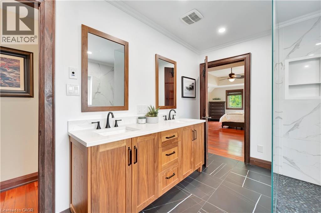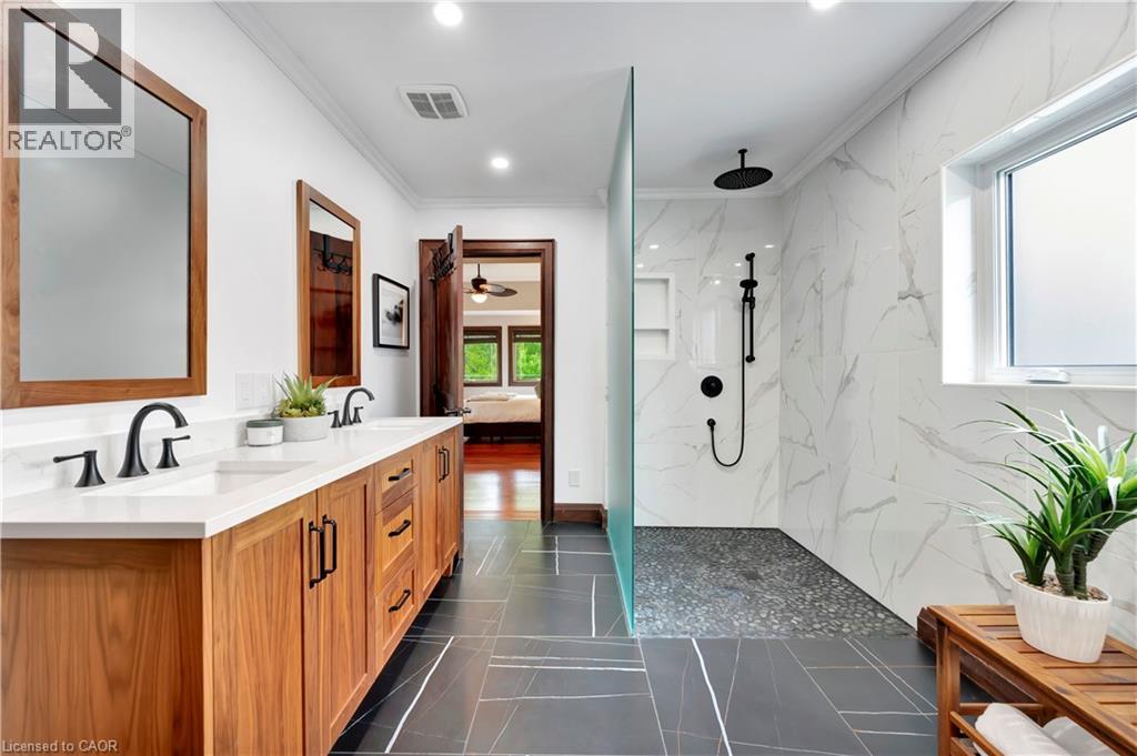 An incredible opportunity to live on one of the most sought-after streets in all of KW! From the moment you arrive you'll be captivated by the striking exterior! The exposed aggregate driveway (10 car parking) is perfectly complemented by three garage bays. Situated on a meticulously landscaped near half acre lot (100’ x 191’), an absolute showstopper inside and out. The expansive open-concept main floor design allows effortless entertaining and comfortable everyday living. The living room offers picturesque views to both the front and rear property, seamlessly flowing into a dining area with walkout access to the backyard deck. The oversized eat-in kitchen is a chef’s dream, featuring a 6-seater island and an abundance of cabinetry and prep space, with an additional corridor of custom cabinetry that leads to a sunken sunroom bathed in natural light. Upstairs, the impressive primary suite is lined with windows, creating a bright, airy retreat. A generous walk-in closet (potential for a second walk-in) complements the spa-inspired ensuite bath. Two additional bedrooms and a large storage room complete the upper level. The thoughtfully designed layout offers flexibility with a ‘secondary wing’, a perfect retreat for extended family or guests. This wing features a stunning living room with soaring vaulted ceilings and oversized windows, full bathroom, two additional bedrooms and large office. With two separate garage entrances, the home also features dual mudrooms, each with its own powder room. The traditional basement area is ideal for entertaining, providing ample space for gatherings and leisure. Outside, the expansive deck leads you to a beautifully private, landscaped backyard oasis. A rare find in the heart of the city! Situated mere steps from one of Canada’s top-rated golf courses, Westmount Golf & Country Club, and within minutes of the region’s finest amenities, shopping, & dining. This is an exceptional offering for those seeking both luxury and lifestyle. (id:4069)